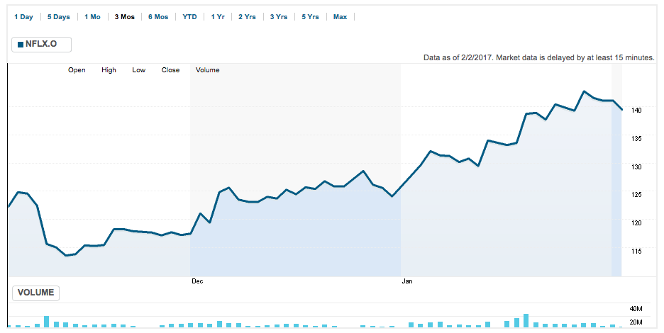 Cabe mencionar que durante el 2016, las acciones de Netflix subieron 8.24% y en lo que va del presente año, vienen creciendo 13.34%.